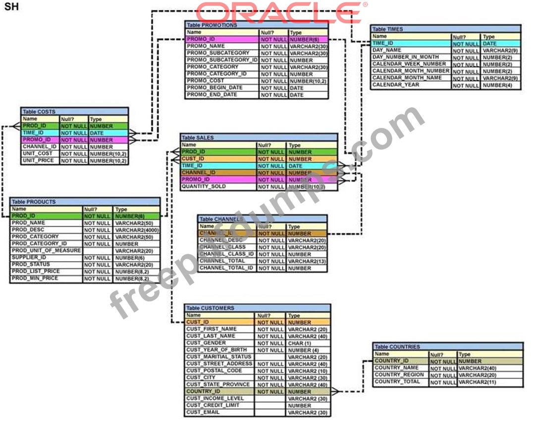 View the exhibit and examine the structure of the SALES, CUSTOMERS, PRODUCTSand TIMEStables.