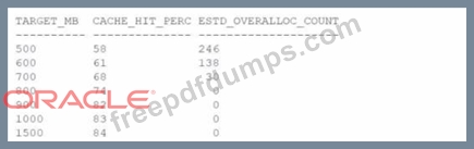 The query output from V$PGA_TARGET_ADVICE provides tuning information for the PGA (Program Global Area). Let's break it down step by step: Key Columns in the Output: * TARGET_MB: * Represents the hypothetical PGA_AGGREGATE_TARGET values (in megabytes) evaluated by Oracle. * CACHE_HIT_PERC: * The percentage of work areas that could execute in-memory (optimal execution) without requiring temporary disk writes. * Higher percentages indicate fewer work areas requiring disk I/O. * ESTD_OVERALLOC_COUNT: * The estimated number of work areas that need to go to disk (multipass operations or overallocations). Observations from the Data: * At TARGET_MB = 700 MB: * The CACHE_HIT_PERC is 68%. * The ESTD_OVERALLOC_COUNT is 30. This indicates that some multipass work areas still exist. * At TARGET_MB = 800 MB: * The CACHE_HIT_PERC rises to 74%. * The ESTD_OVERALLOC_COUNT drops to 0. This indicates that no work areas require multipass execution. * At TARGET_MB = 900 MB and above: * The CACHE_HIT_PERC increases slightly to 82%-84%. * The ESTD_OVERALLOC_COUNT remains 0, meaning that all work areas are now either optimal or one-pass. Why D is Correct: * At 800 MB or more, the ESTD_OVERALLOC_COUNT is 0, indicating that all one-pass execution work areas are eliminated. * A one-pass execution requires temporary disk I/O for intermediate results, but with sufficient PGA, these are no longer necessary. Why Other Options Are Incorrect: * Option A: * It mentions all multipass executions work areas would be eliminated at 700 MB. This is incorrect because, at 700 MB, the ESTD_OVERALLOC_COUNT is still 30, indicating some multipass work areas still exist. * Option B: * Suggests setting the PGA_AGGREGATE_TARGET to at least 800 MB, which is partially correct but does not address the elimination of one-pass execution. * Option C: * Suggests setting the PGA_AGGREGATE_TARGET to at least 700 MB, which is not sufficient to eliminate all one-pass executions, as shown by the ESTD_OVERALLOC_COUNT of 30.