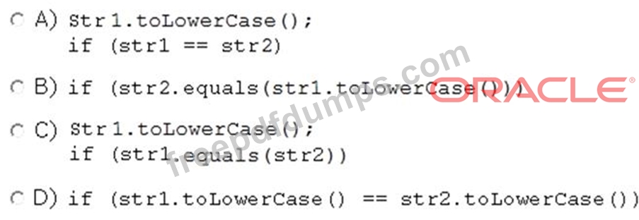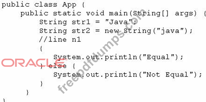 Which code fragment, when inserted at line n1, enables the App class to print Equal?