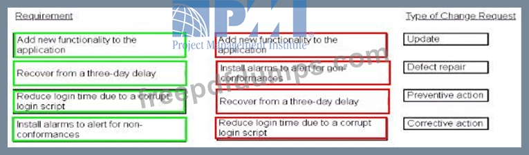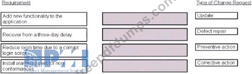 A team receives four different requests from separate stakeholders related to one application Match each requirement with its corresponding type of change request.