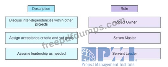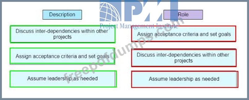 A new project manager for an agile project is reviewing with an established team, some of the roles to avoid confusion on what to expect. Drag the description on the left to the role on the right