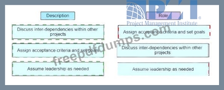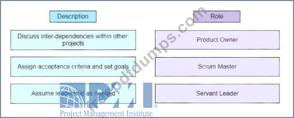 A new project manager for an agile project is reviewing with an established team, some of the roles to avoid confusion on what to expect. Drag the description on the left to the role on the right