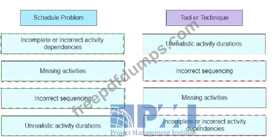 A few months into a project, several schedule issues have emerged Drag the schedule problems on the left to the specific tools on the right that if implemented during schedule development could have prevented the issues.