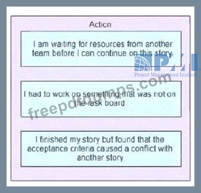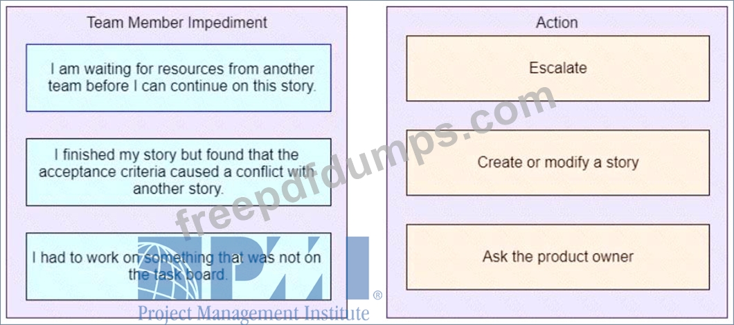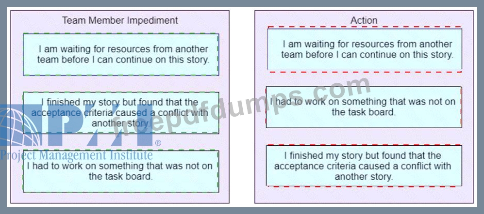 The team has reported the following impediments at the daily standup meeting Drag each impediment on the left to the action that the project manager needs to take on the right