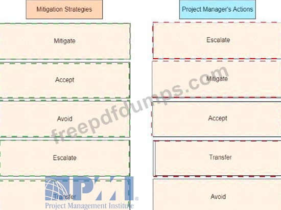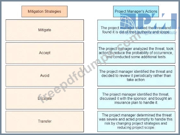 An experienced project manager is overseeing a merger and acquisition project. The project manager reacted differently to different threats identified on the project Drag the mitigation strategy on the left to the project manager's actions on the right