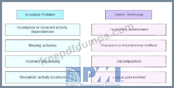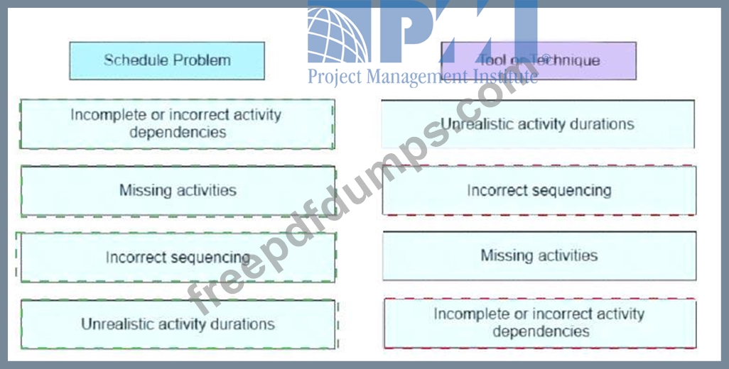 A few months into a project, several schedule issues have emerged Drag the schedule problems on the left to the specific tools on the right that if implemented during schedule development could have prevented the issues.