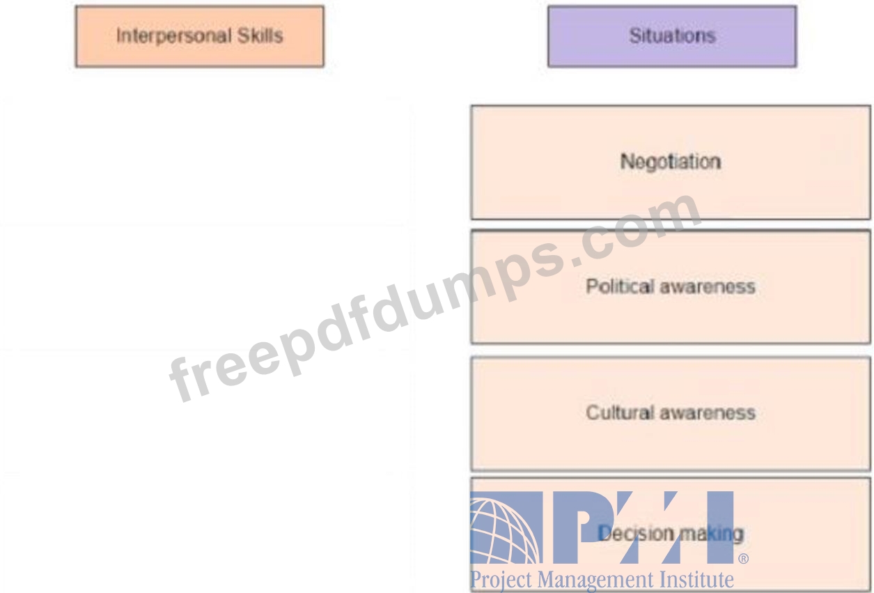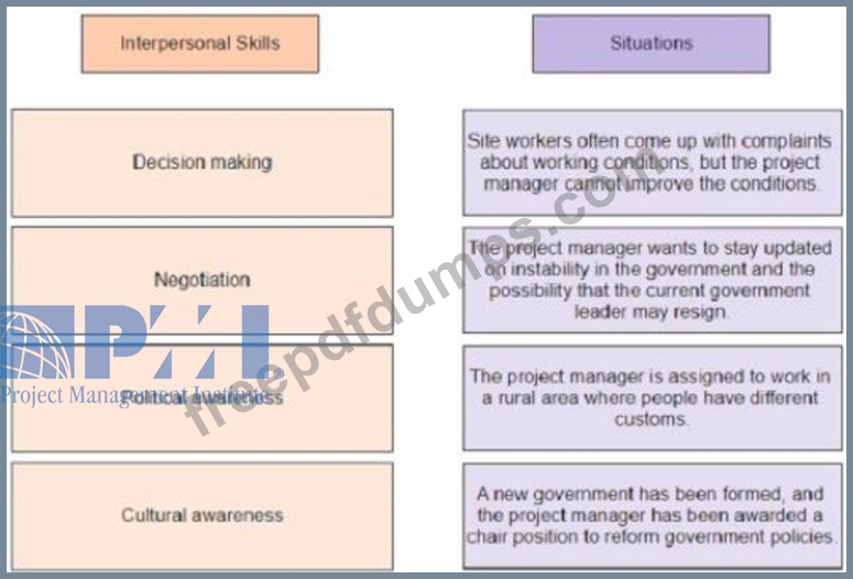 A project manager for a government organization often deals with stakeholder engagement issues. Drag the interpersonal skill the project manager should use on the left to the correct situation on the right.