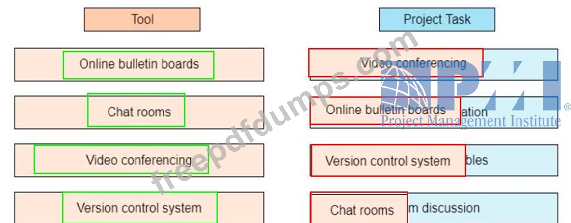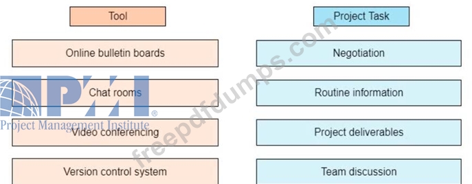 An agile team is geographically separated across multiple continents, and the project manager of identifying the tools to manage the communication among the virtual teams Drag the appropriate tool on the left to each project task on the right