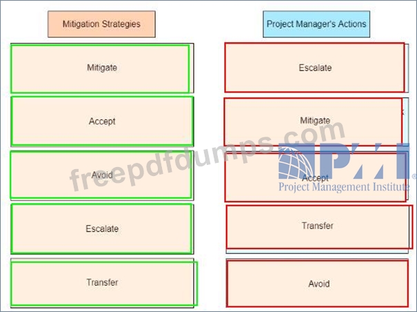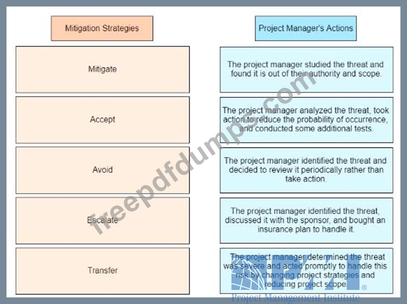An experienced project manager is overseeing a merger and acquisition project. The project manager reacted differently to different threats identified on the project Drag the mitigation strategy on the left to the project manager's actions on the right