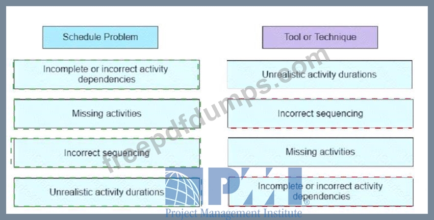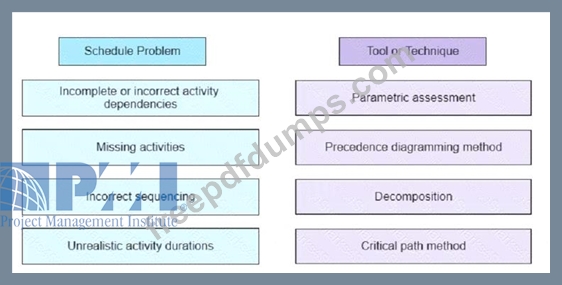 A few months into a project, several schedule issues have emerged Drag the schedule problems on the left to the specific tools on the right that if implemented during schedule development could have prevented the issues.