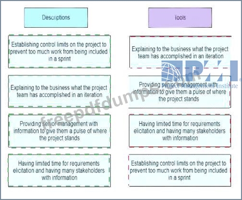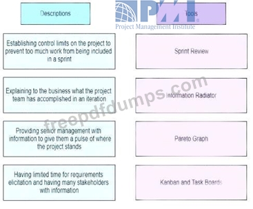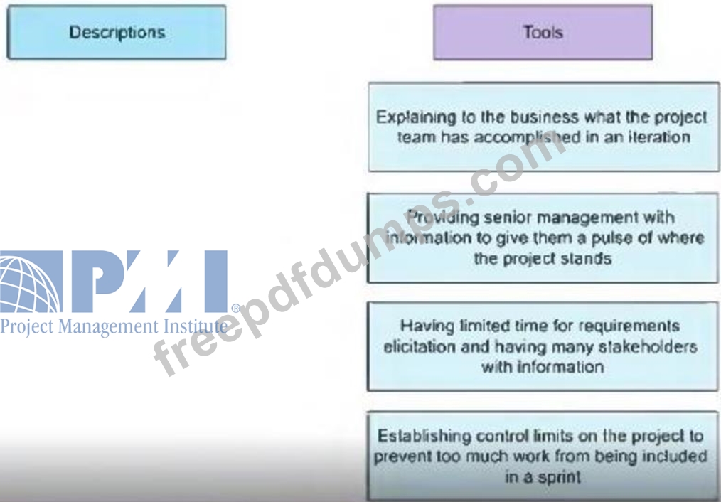 A junior project manager with experience in predictive projects has joined a company that uses hybrid approaches for project delivery. A senior project manager with experience in hybrid approaches is assigned to be a coach. Match the activity descriptions on the left to the correct tools on the right.