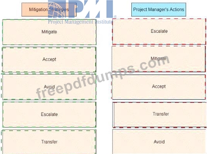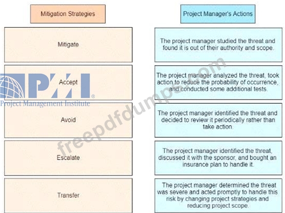 An experienced project manager is overseeing a merger and acquisition project. The project manager reacted differently to different threats identified on the project Drag the mitigation strategy on the left to the project manager's actions on the right
