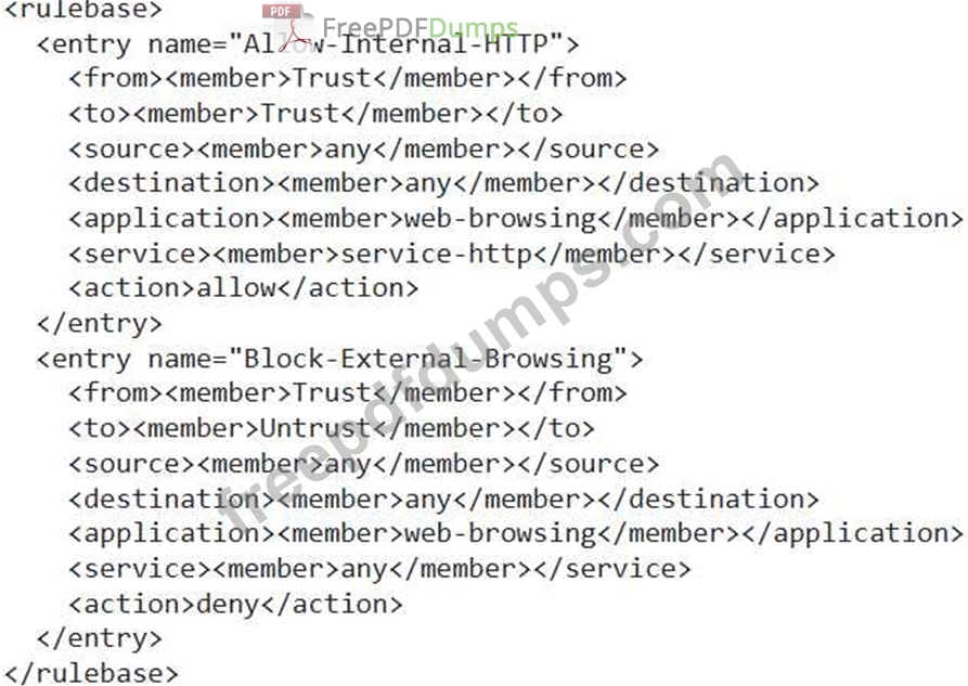 Consider the following firewall policy configuration snippet from a Panorama managed firewall: