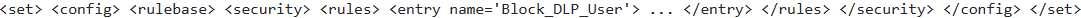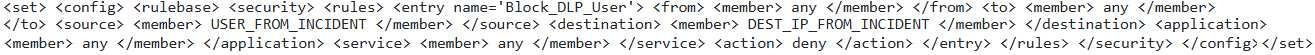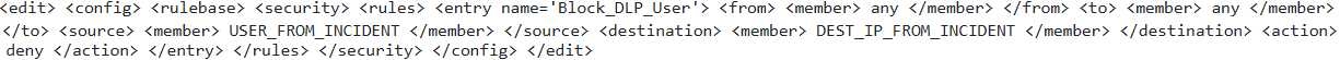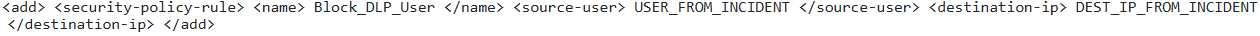 A Palo Alto Networks Network Security Engineer is developing an automated remediation script to respond to specific, repeatable 'DLP Violation' incidents. The script needs to retrieve the 'source-user' and 'destination-IP' from the incident, dynamically create a new security policy rule to block the 'source-user' from accessing the 'destination-IP', and then commit the changes. Assuming the script can query the Incidents and Alerts page API (using XSOAR or custom code) for active incidents and interact with the firewall via its XML API/REST API, what is the MOST critical data point to extract from the incident, and which API operation would be necessary for creating the blocking rule?