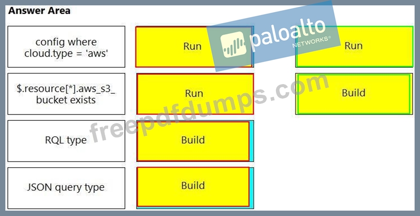 You wish to create a custom policy with build and run subtypes. Match the query types for each example.
