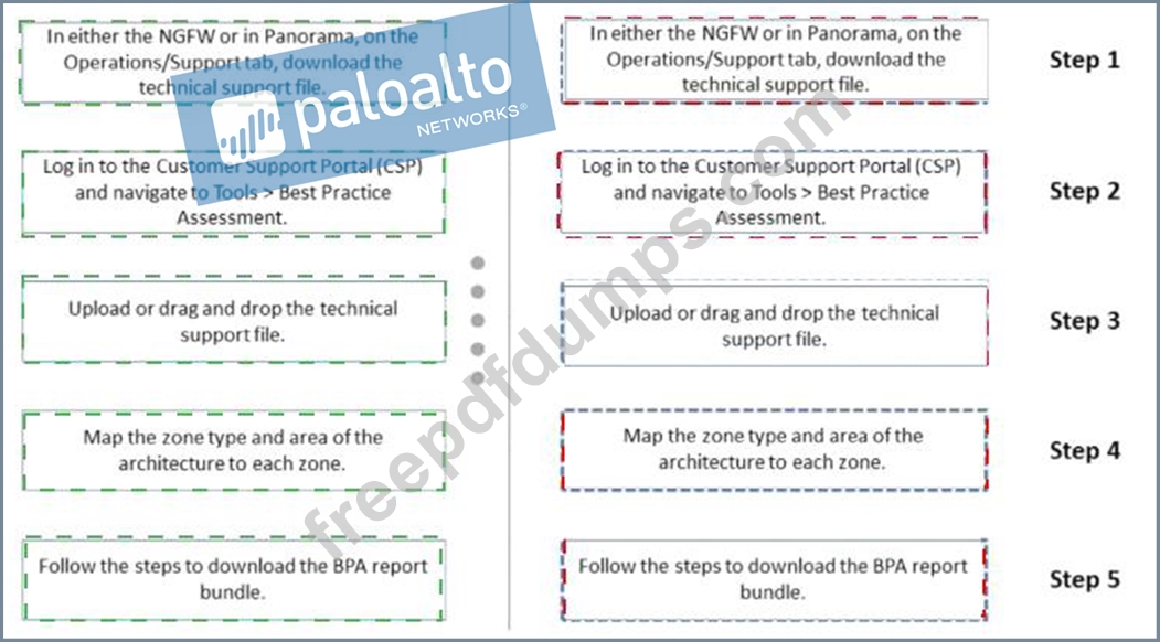 Below are the steps in the workflow for creating a Best Practice Assessment in a firewall and Panorama configuration Place the steps in order.
