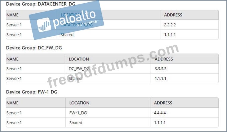 2. There are no objects configured in REGIONAL_DG and OFFICE_FW_DG device groups Which IP address will be pushed to the firewalls inside Address Object Server-1?
