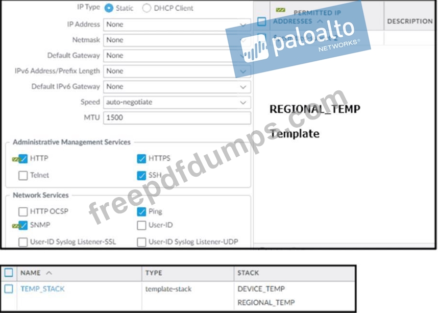 Based on the screenshots above, and with no configuration inside the Template Stack itself, what access will the device permit on its Management port?