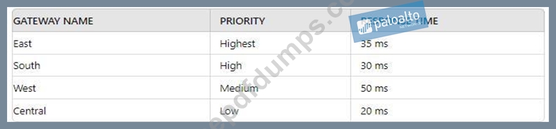 A security engineer has configured a GlobalProtect portal agent with four gateways Which GlobalProtect Gateway will users connect to based on the chart provided?