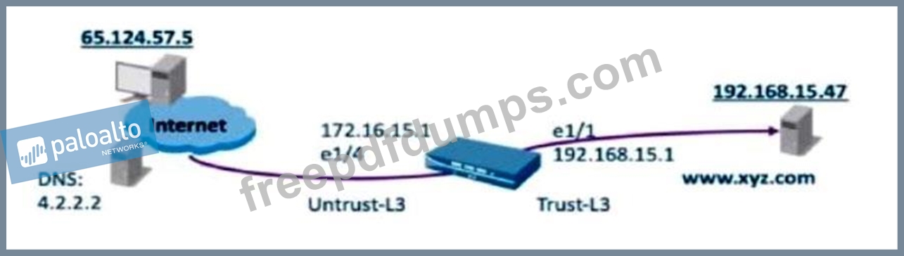 A user at an external system with the IP address 65.124.57.5 queries the DNS server at 4.2.2.2 for the IP address of the web server, www.xyz.com. The DNS server returns an address of