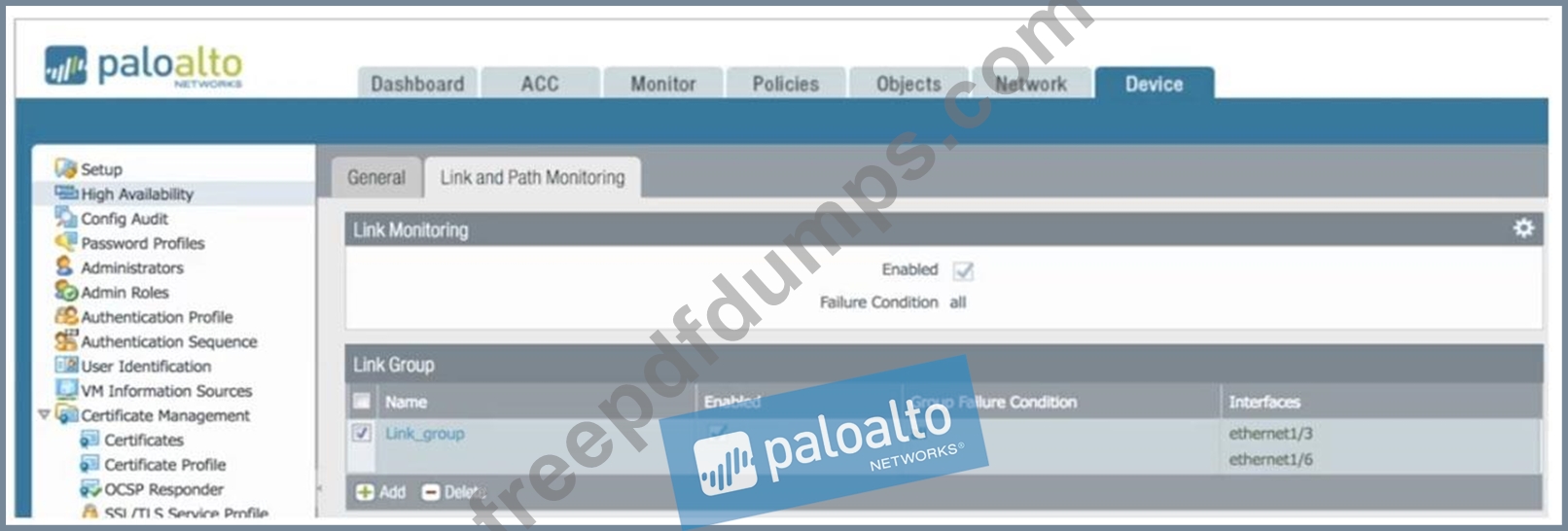 If the firewall has the following link monitoring configuration, what will cause a failover?