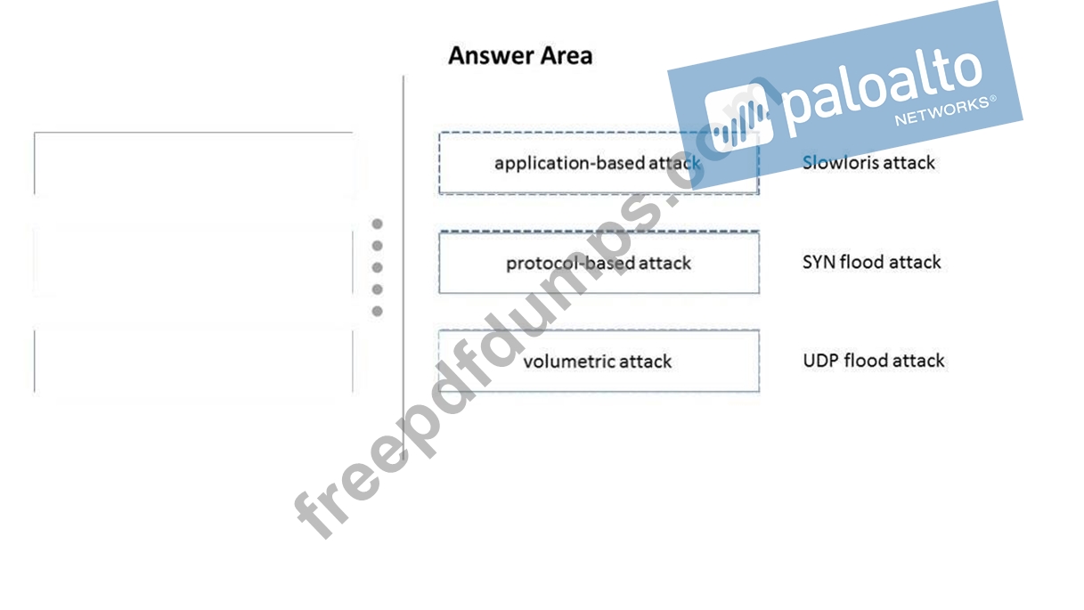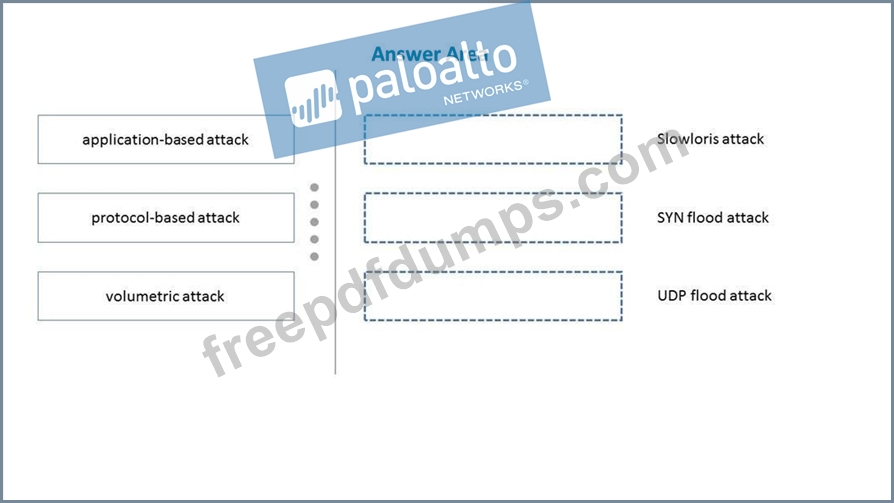 Based on PANW Best Practices for Planning DoS and Zone Protection, match each type of DoS attack to an example of that type of attack.