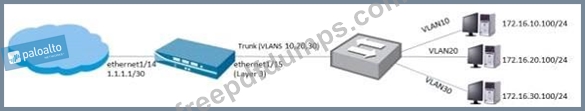 A network design calls for a "router on a stick" implementation with a PA-5060 performing inter- VLAN routing. All VLAN-tagged traffic will be forwarded to the PA-5060 through a single dot1q trunk interface.