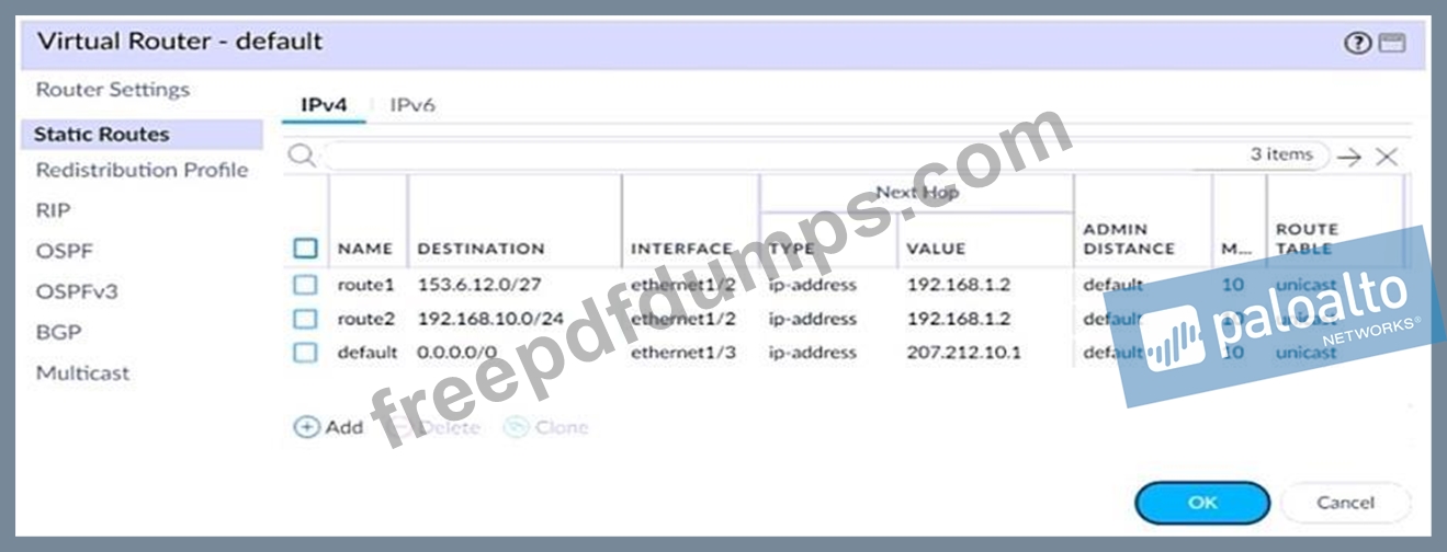A firewall engineer creates a destination static NAT rule to allow traffic from the internet to a webserver hosted behind the edge firewall. The pre-NAT IP address of the server is 153.6.12.10, and the post-NAT IP address is 192.168.10.10. Refer to the routing and interfaces information below.