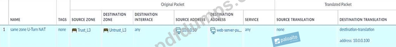Review the information below. A firewall engineer creates a U-NAT rule to allow users in the trust zone access to a server in the same zone by using an external, public NAT IP for that server.