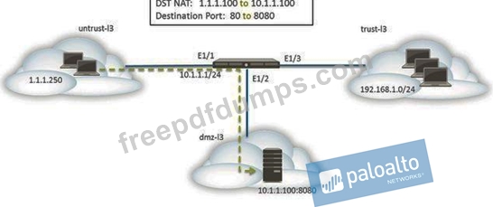The web server is configured to listen for HTTP traffic on port 8080. The clients access the web server using the IP address 1.1.1.100 on TCP Port 80. The destination NAT rule is configured to translate both IP address and report to 10.1.1.100 on TCP Port 8080.