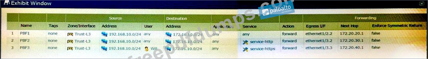 Refer to Exhibit. A firewall has three PBF rules and a default route with a next hop of 172.20.10.1 that is configured in the default VR. A user named Will has a PC with a 192.168.10.10 IP address.