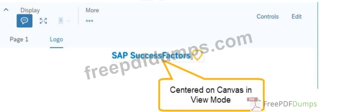 You are configuring a story report. You add the image widget to the top-left corner of the canvas. You then upload the SuccessFactors logo in the Builder and select the logo image so it displays on the canvas. When you preview the report in View Mode, the logo appears centered on the canvas.