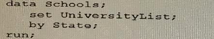 In SAS, when you use a BY statement in a DATA step, SAS creates two temporary variables for each variable listed in the BY statement: one to indicate the first occurrence (FIRST.variable) and another to indicate the last occurrence (LAST.variable) of the value within the BY-group. Given the provided code and assuming that State is the variable used in the BY statement, SAS will create First.State and Last.State. Thus, option A is correct. References: * SAS documentation on the BY statement, SAS Institute.