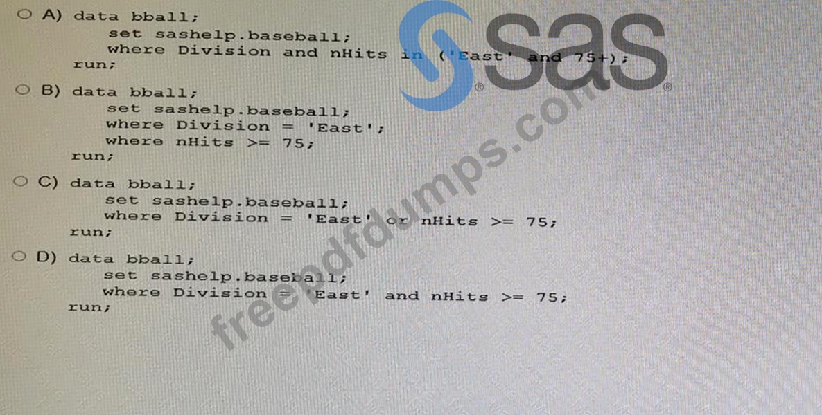 Which program correctly subnets the SASHELP. BASEBALL data set to include only the players in the East Division with 75 or more hits?