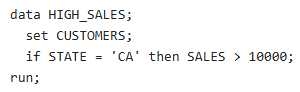 You have a SAS dataset named 'CUSTOMERS' with variables 'CUSTOMER ID', 'CITY', 'STATE', and 'SALES'. You need to create a new dataset called 'HIGH SALES' containing only customers from the state 'CA' who have sales greater than $10000. Which code snippet will achieve this?