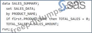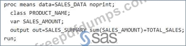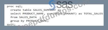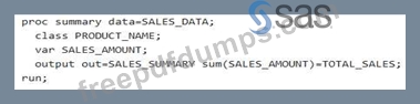 You have a SAS dataset 'SALES DATA with variables 'PRODUCT ID' (numeric), 'PRODUCT NAME' (character), 'SALES AMOUNT' (numeric), and 'SALES DATE' (date). You need to create a new dataset 'SALES SUMMARY' that summarizes total sales by product, grouping by 'PRODUCT NAME'. Which of the following SAS code snippets correctly creates the 'SALES SUMMARY' dataset with the required summarization?