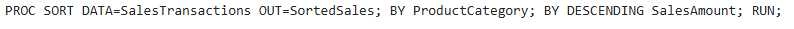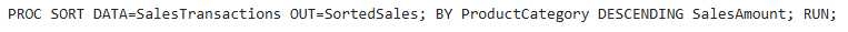 You are analyzing a dataset of sales transactions with various product categories. You want to sort the data by sales amount in descending order, but only within each product category. Which PROC SORT statement would achieve this?