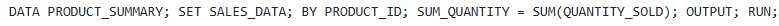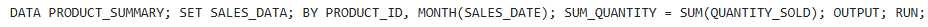'QUANTITY SOLD'. You want to create a new data set called 'PRODUCT SUMMARY' that summarizes the total quantity of each product sold per month. Which DATA step code snippet correctly creates this summary dataset using a 'BY' statement?