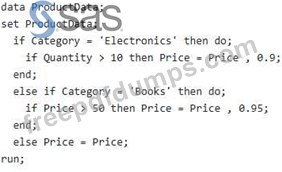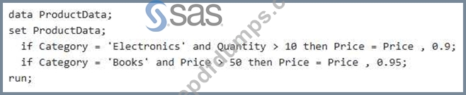 You have a dataset 'ProductData' with variables 'ProductlD', 'ProductName', 'Price', 'Quantity', and 'Category'. You need to update the 'Price' variable based on the following criteria: 1. If 'Category' is 'Electronics' and 'Quantity' is greater than 10, apply a 10% discount on the 'Price'. 2. If 'Category' is 'Books' and 'Price' is greater than 50, apply a 5% discount on the 'Price'. 3. Otherwise, leave the 'Price' unchanged. Which of the following DATA step code snippets will achieve this correctly?