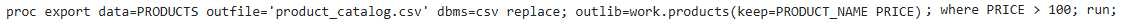 You have a SAS dataset 'PRODUCTS' with variables 'PRODUCT ID', 'PRODUCT NAME', and 'PRICE'. You need to export this dataset to a CSV file 'product_catalog.csv', but you want to exclude the 'PRODUCT ID' variable and only include rows where 'PRICE' is greater than 100. Which PROC EXPORT statement will achieve this?