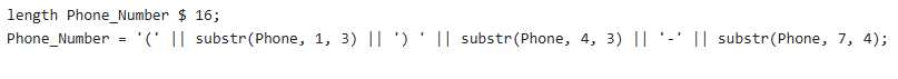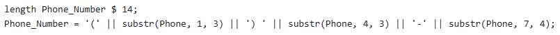 You need to create a new character variable called 'Phone Number' in a dataset, which should store phone numbers in the format (XXX) XXX-XXXX. You want to ensure that the variable is capable of storing the entire formatted phone number and no more. Which of the following LENGTH statements will correctly define the variable and ensure that the format is preserved? ' 'Note' ': Assume that the original variable 'Phone' holds phone numbers in the format XXXXXXXXXX.