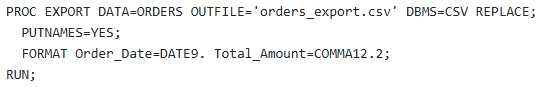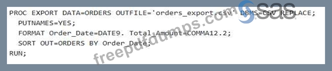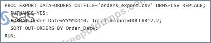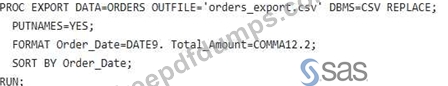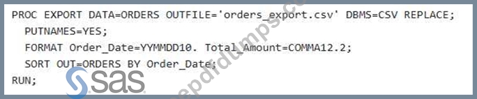 You have a SAS dataset named 'ORDERS' with the following structure: Order ID,Customer ID,Order Date,T0tal Amount You need to export this data to a CSV file named 'orders_export.csv' with the following requirements: 1. The data should be sorted by 'Order Date' in ascending order. 2. The 'Order Date' column should be formatted as 'YYYY-MM-DD'. 3. The 'Total Amount' column should be formatted as a comma-separated numeric value with 2 decimal places. Which of the following PROC EXPORT statements would achieve this correctly?