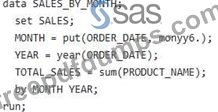 You have a SAS dataset 'SALES' with variables 'ORDER DATE' (numeric, date format) and 'PRODUCT NAME'. You need to create a new dataset 'SALES BY MONTH' that summarizes the sales by month. The dataset should include the month (as a character variable 'MONTH'), the year (as a numeric variable 'YEAR'), and the total sales for that month ('TOTAL SALES'). Which SAS code snippet correctly creates 'SALES BY MONTH'?