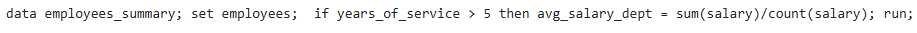 You have a dataset called 'EMPLOYEES' with variables 'DEPARTMENT', 'SALARY', and 'YEARS OF SERVICE'. You want to create a new variable called 'AVG SALARY DEPT' that contains the average salary for each department, considering only employees with more than 5 years of service. What SAS code snippet would correctly achieve this?