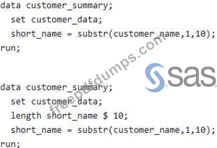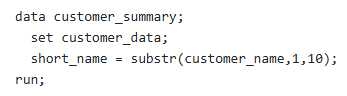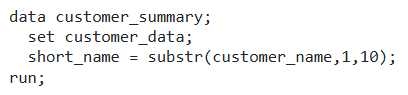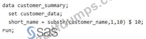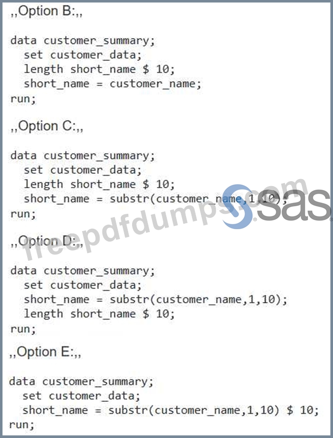 You are working with a SAS dataset named 'customer_data' that has a variable named 'customer_name' with a length of 30 bytes. You want to create a new dataset named 'customer summary' and include only the first 10 characters of the 'customer name' variable in a new variable called 'short_name'. Which of the following code snippets will achieve the desired result? "Option A:"