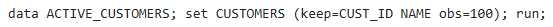 You have a SAS dataset named 'CUSTOMERS' with variables 'CUST D', 'NAME', 'CITY', 'STATE', and 'ZIP'. You need to create a new dataset called 'ACTIVE CUSTOMERS' that contains only the first 100 observations from the 'CUSTOMERS' dataset and includes only the 'CUST ID' and 'NAME' variables. Which code snippet will correctly achieve this?