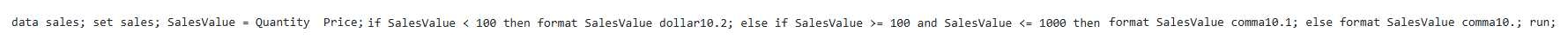You are tasked with creating a report that displays the sales figures for different products. The sales data is stored in a dataset named 'SALES' with variables 'Product', 'Quantity', and 'Price'. You want to create a new variable called 'SalesValue' by multiplying 'Quantity' and 'Price', and then present the 'SalesValue' in a formatted way using the following conditions: - For 'SalesValue' less than 100, display the value with a '$' prefix and two decimal places. - For 'SalesValue' between 100 and 1000, display the value with a 'K' suffix and one decimal place. - For 'SalesValue' greater than 1000, display the value with an 'M' suffix and no decimal places. Which of the following code snippets correctly implements the required formatting using the FORMAT statement for temporary attributes?