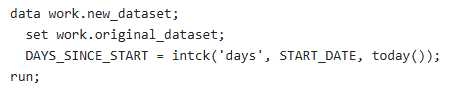You are working with a dataset containing a variable 'START DATE' that stores dates in the format 'YYYY-MM- DD'. You need to create a new variable 'DAYS SINCE START' that calculates the number of days since the start date for each record. Which SAS code snippet correctly achieves this?