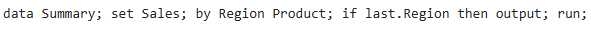 Consider a dataset 'Sales' with variables 'Region', 'Product', and 'Sales_Amount'. You need to create a new dataset 'Summary' that reports the total sales for each region and product combination, but only for regions where the total sales exceed $10,000. Which SAS code would you use to achieve this?