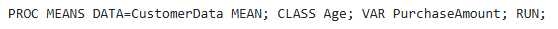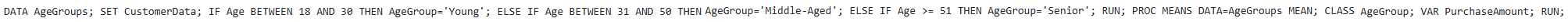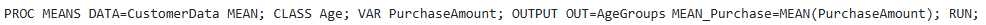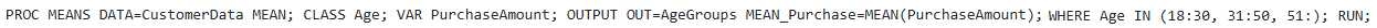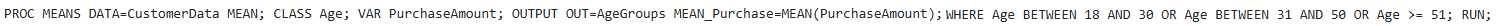 You have a dataset 'CustomerData' containing 'CustomerlD', 'Age', 'Income', 'PurchaseAmount', and 'PurchaseDate'. You want to analyze the average purchase amount for customers in different age groups. You need to group customers based on their age into three categories: 'Young' (18-30), 'Middle-Aged' (31-50), and 'Senior' (51+). Which code snippet would you use to correctly group customers and calculate the average purchase amount for each age group using PROC MEANS?
